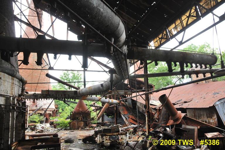Reheating furnace flue goes up to stack, but part of the flue is missing.