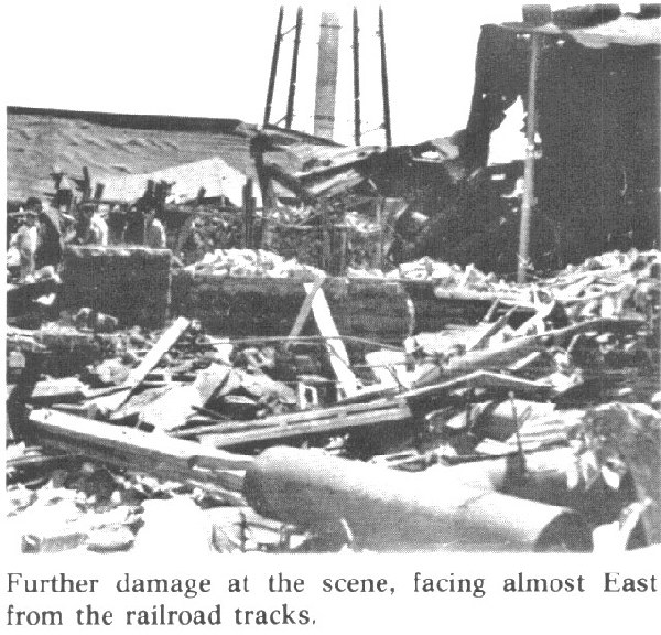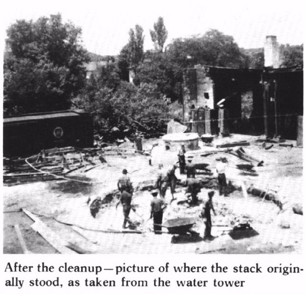 80 feet high, containing some 75,000 bricks weighing approximately 280 tons, the stack was part of the original plant erected in 1906. The stack, though still in use had been repaired several times. Seven or eight years is the normal lapse of time between repairs. The plant is closed, the crown fire put out, the furnace permitted to cool, and mortarmen examine the entire chimney. Bricks are replaced, seams and joints are pointed, and other danger spots attended to. The stack had probably been checked at least three times -1915, 1923 and 1930 being the likely inspection dates. Because of the Great Depression, an overhaul which was due in the late `30s had been delayed. Obviously, it had been delayed too long!
