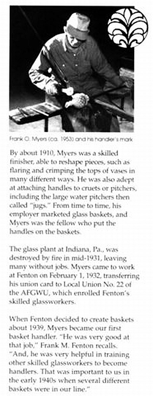 The “blanks” were decorated with designs created by Frank L. Fenton, who had done that sort of work for several employers prior to founding his own business. In 1907, decorating was an important part of the Williamstown operation. Charles Fenton had been a decorator for the Northwood plant in Indiana, PA in 1900, and was in charge of the new decorating endeavor at Fenton Glass. Decorated lemonade sets were quite popular until the Depression years when hard times diminished demand for other than practical items. The decorating department was phased out.