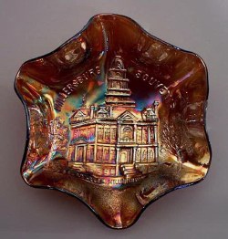 In June of 1910, the world famous Millersburg Court House souvenir bowl was produced as a tribute to the town of Millersburg and given away by the hundreds. John Fenton was a very generous man. He commissioned many molds to be made and glass produced as a "gesture of thanks" in appreciation for various people and organizations. Much of this glass was given away at the Millersburg factory.