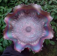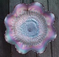 ![]() Sunflower A is a very pretty bowl with good color but there is extensive edge damage. The repairs are good ones and it displays well from a distance. Because of the damage, it is appropriately priced at 40.00. It would make a nice display piece or a holding piece until a better example can be found or even a very pretty bowl to set on a counter or coffee table. This bowl will probably never increase in value. Enjoy a bowl like this for it's beauty. It's still an impressive bowl. I ought to know, I once owned it. It sat on my coffee table. Non carnival collectors were VERY impressed with it and not one of them ever noticed the damage.