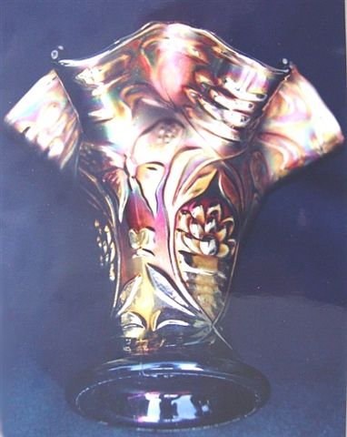 Perhaps someone out there has some answers? This example is not a new find, as I acquired it from a couple who started collecting carnival glass many years ago. They purchased it in April of 1964 at a show in Indiana for $9. At that time, these vases were listed in Marion Hartung’s price guide at $32. The vase was in their care for 34 years and now I hope to watch over it for at least that long.