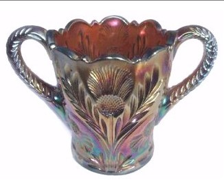 ![]() Bowls: Various sizes and shapes in both purple and green. These are rare but less desirable than the other pieces in this pattern. The pattern is on the reverse side making them difficult to display. An 8” round amethyst bowl in Inverted Thistle sold Nov. 22, 2003 for $200. The Adams enjoyed collecting the very unusual in Carnival Glass. This auction provided some examples which had not come up to public sale for many years.