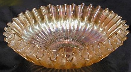 ![]() STIPPLED RAYS: The TCR edge or Crimp on this round marigold bowl completely encircles the piece. This type edge can be found on pieces made by Fenton and Dugan (for the most part). The glass handler applies a crimping tool to create this edge.