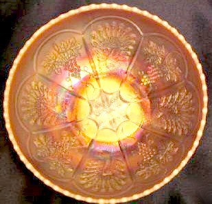 ![]() PEACOCK and GRAPE: EIGHT RUFFLE examples are known in Fenton, Northwood and Dugan patterns, but seldom found on Millersburg examples. Most of their bowls are the 6 ruffle variety. Crown Crystal examples of Australian manufacture are known to have ten ruffles in some patterns.