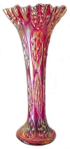 Knotted Beads is found in heights ranging from 9 -11” in colors of Amber, Amethyst, Aqua, Blue , Green, Marigold, Vaseline, (scarce), as well as the rare Red. Many examples exhibit the Candy Ribbon Edge.