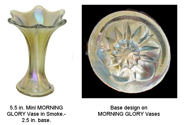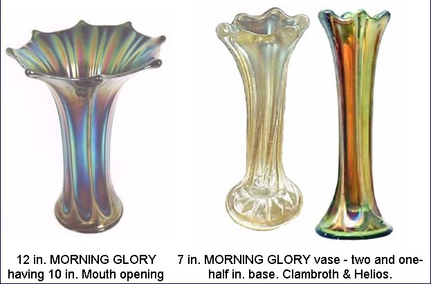 ![]() ![]() ![]() Morning Glory vases are found only in six sizes and styles of vases and gets its name from its basic shape. The flared top tends to resemble the beautiful flower from which the name derives. The miniature vase stands only 3 to 4 ½ tall and is found most often in marigold. Helios is somewhat more difficult, with purple and smoke examples being scarce. The small vase stands from 5 to 7 tall and is found in the above named colors, along with a very rare cobalt blue example.