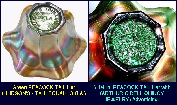![]() ![]() PEACOCK TAIL Hats: (Fenton) These are typically found in ruffled shape. Green seems to be the dominant color used for the molded lettering found on such hats.