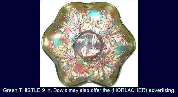 ![]() THISTLE 9” Bowls: (Fenton) Lettered examples may have ruffled, 3/1, or CRE in green and amethyst.