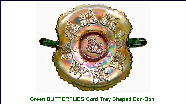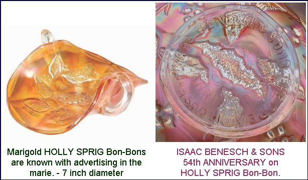 ![]() HOLLY SPRIG BonBon: (Millersburg) The card tray shape bonbon having The GREAT HOUSE of ISAAC BENESCH lettering within the marie is found on marigold examples. Very few sell during any given auction year.