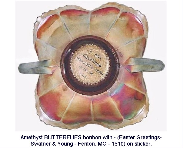 ![]() ![]() BUTTERFLIES BonBon: (Fenton) in amethyst, having the extremely unusual foil sticker intact with EASTER GREETINGS may be a one-of-a-kind? This four-sides up example appeared for sale in a Reichel Auction in 2004. Surely, over the years, many of the foil labels were removed from other such examples.