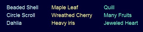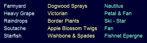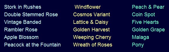 ![]() All of these patterns which originated during the Dugan years, can be found in marigold.
