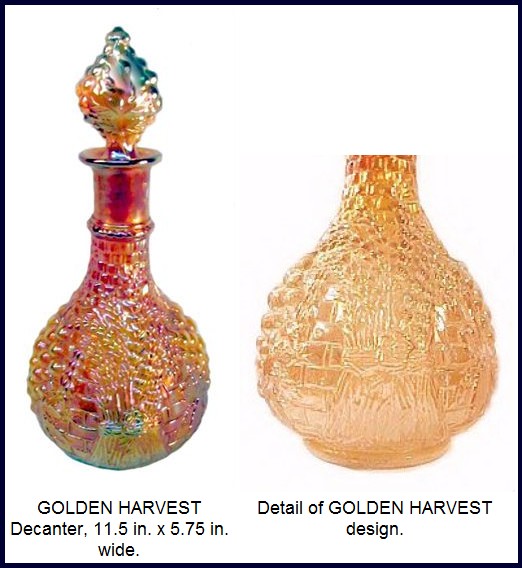 ![]() ![]() ![]() GOLDEN HARVEST: Shards were found in the Helman diggings, concluding that this interesting wine set was made in Indiana, PA. No other shapes are known to carry this pattern. The stemmed wines and decanter in this all over grape/leaf design first appeared in wholesale catalogs in 1916. The June issue of Butler Bros. catalog offered a marigold set, calling it “Golden Iridescent”. Neither marigold nor amethyst decanters turn up often. Wines are seen on occasion, with none of the pieces particularly well endowed with iridescence.