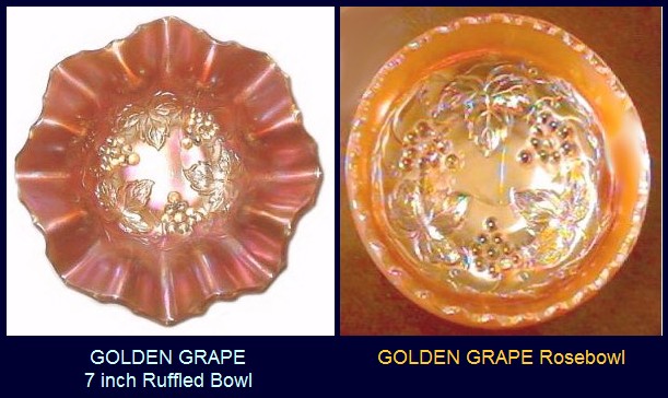 ![]() GOLDEN GRAPE: Production of this simple, but very pretty design was limited to 6”-7” bowls in marigold and amethyst, with marigold being rather plentiful. Only a few amethyst examples have been found. Green has been reported? Bowls may be either round or ruffled. Rose bowl shape, fashioned from the same mold is known in marigold, but these are rather scarce.