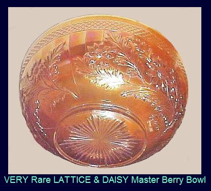 ![]() LATTICE & DAISY Berry Bowl: Master size berry is known in marigold, with only a handful known. The small berry bowl is no more plentiful. This set is the rarest of items known in this pattern. A small white bowl is known.