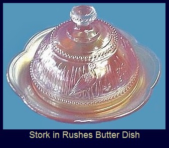 ![]() STORK in RUSHES Butter Dish: Table sets scarcely ever surface and have been seen only in marigold and amethyst. This design was the most extensive of Diamond's carnival lines. 16 different items have been documented, many of which are readily available. Others are extremely rare!