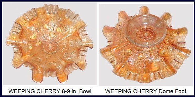 ![]() WEEPING CHERRY: Relative scarcity of this pattern, along with the known colors and mold characteristics, Weeping Cherry probably dates from the early 1920s. Found only on the interior of 8”- 9 1/2” dome-footed bowls, three colors have been reported: marigold, cobalt blue and amethyst. Marigold bowls are scarcely ever seen, and cobalt blue ones should be classed as rarities, indeed! Rarer still are the amethyst examples, with fewer than half dozen known.
