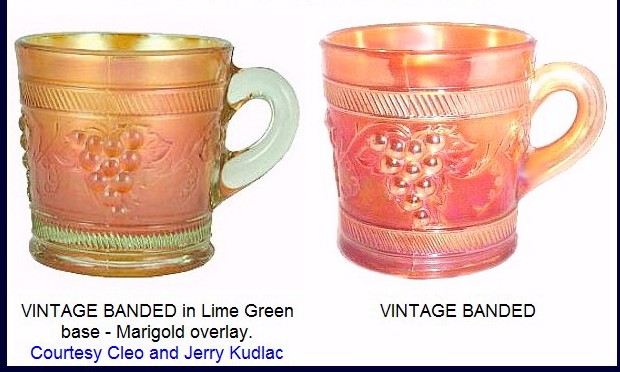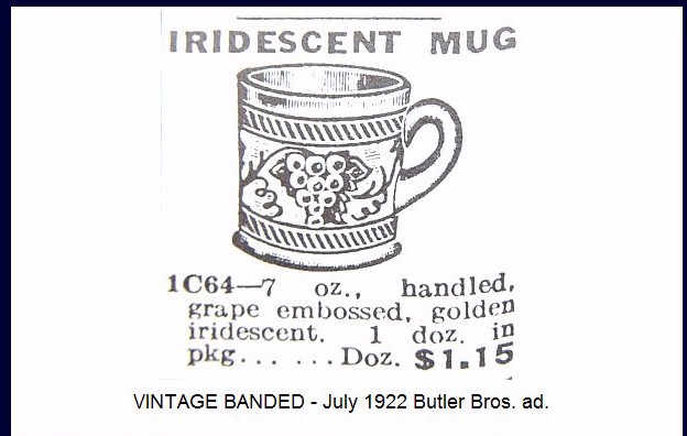 ![]() ![]() ![]() VINTAGE BANDED Mug: Some semblance to the design found on Dugan's Vintage perfume bottle and powder jar may be noted here. However, Vintage Banded is a later pattern, dating from Diamond production years. Wholesale catalogs were displaying it in 1922, continuing to do so through 1930, indicating a long production period. These mugs in marigold are easily found. Smoke examples are few and far between since smoke color was not used to any large degree by Diamond. (The time frame of production coincides with the bulk of Imperial's production of smoke colored items.) The unusual lime green base with marigold overlay is rarely seen! This type light green base glass is mindful of the After Glow series. In future, we will have a couple of segments surrounding this specialized carnival glass which is quite difficult to locate today.