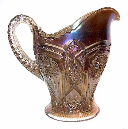 OCTAGON : Marigold water sets are quite plentiful in this cut pattern. It is easily recognized with at least 23 carnival glass shapes having been documented. Purple water sets are extremely rare! These tankard, or water pitchers stand only 1 ½” taller than the 8” milk pitchers. A yet smaller 6 ½” pitcher is quite scarce in marigold and downright rare in purple. With so little difference in the size of the water and milk pitchers, unless they are together for comparison, it is easily understood that an error in judgment can be made as to which one is which!