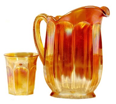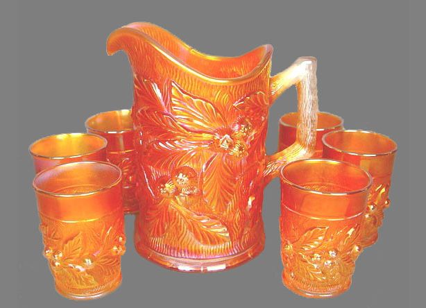 WISHBONE: Pitchers are mould-blown with separately applied handle. Marigold and amethyst tumblers appear once in awhile, but the green tumblers are quite evasive! The pitchers are not plentiful in any of the three colors mentioned. Creation of the carnival glass sets occurred during the 1911-1912 period. With one pearlized custard tumbler known, we must assume that production of the pattern resumed during 1914-1915 when Northwood revived their custard glass production.
