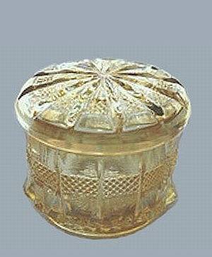 PORTLAND VT. : Said to be the only Portland tumbler mold made by U.S. Glass. It is a light amber-type marigold with pastel iridescence. The tumbler is four inches tall with a top diameter of 3 3/8 inches. The base is 2 ¼ inches diameter and has been factory ground. There is a 20 point incised star design in the base. The Portland pattern table set is shown in Butler Bros. Oct. 1909 Catalog issue in company with other known U.S. Glass patterns on the same page. Drawings of various forms in the Portland pattern are shown on page 155 of U.S. Glass from A to Z by William Heacock and Fred Bickenhauser. Only two or three iridized Portland tumblers are known. Bob Smith graciously provided us with a photo of his.