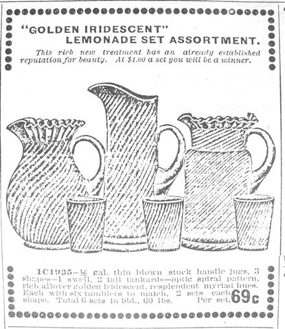 1909 Butler Brothers Ad: Left to right are variants #4, #1, and #5 Northwood Swirl Rib water sets. This is the earliest documented appearance of Northwood carnival glass water sets in the wholesale catalogs. These styles were marketed on into the 1910 timeframe.
