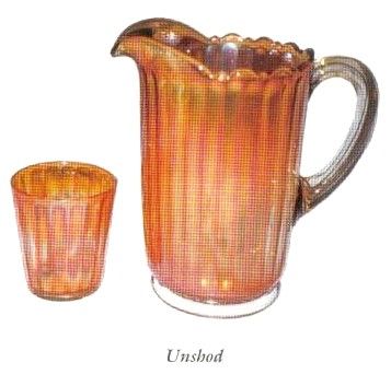 Since every manufacturer succeeds in producing some likeness to a “colonial” design, this name certainly seems to fit appropriately when viewing the design. Measurements for these elements: Pitcher - 8”; Tumbler - 3 5/8” in height.
