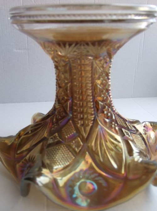 BROKEN ARCHES: is an interesting pattern and somewhat scarce among the many geometric designs from Imperial. Some of the bowls and cups have a smooth interior, while others offer a ribbed interior design. The iridized versions of this pattern appeared in the wholesale catalogs in 1911, with a curious number: Snap-14. Marigold and purple are the standard colors. This vaseline example of a fruit bowl and base are quite a step away from the “norm”. The pattern always commands attention in an auction unless the finish is of a dull, silvery, gun-metal type iridescence, detracting from usual values.