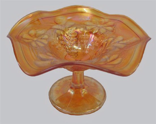 FERN Compote: Here is an ideal example for pattern collectors! Fern is found exclusively in the compote shape. Production dates to the 1911-1912 timeframe. Amethyst, green and marigold are the standard colors. A 1912 Butler Brothers Catalog ad advertises white. To our knowledge, none have been reported……However, this ice blue compote revealed itself in a 2012 Tom Burns auction! We have noted over the years that compotes and bonbons are not collected with as much “vigor” as bowls and plates. Perhaps this is the reason prices have remained “moderate”?