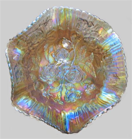This color is found only on Imperial iridized glass and is best described as a light to medium charcoal gray. The 1996 Imperial Glass Book by Carl O. Burns continues the description as a color found in a fairly wide variety of patterns and shapes. Bowls, plates, vases, novelty items and those having geometric designs are the most frequently found items in this curious color. Water sets and punch sets are more difficult to locate in smoke. Shapes within certain patterns found in smoke are as follows: (Of course there are many other patterns found in smoke. We cannot display all of them in this segment.) We can name those for you.