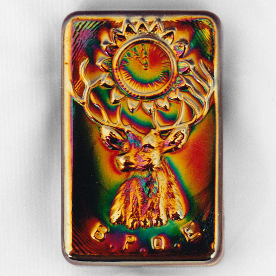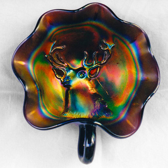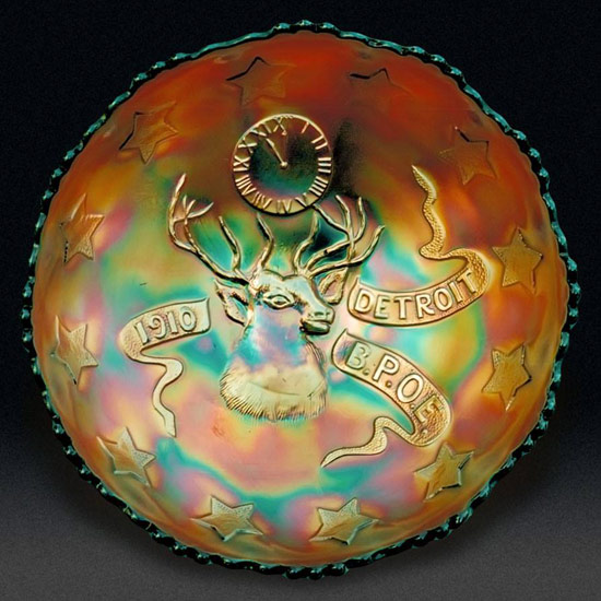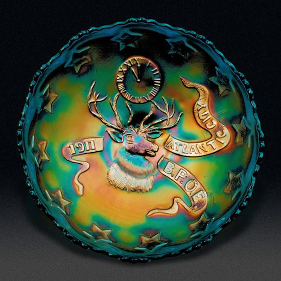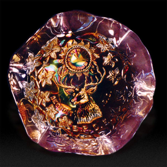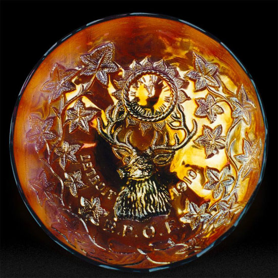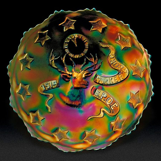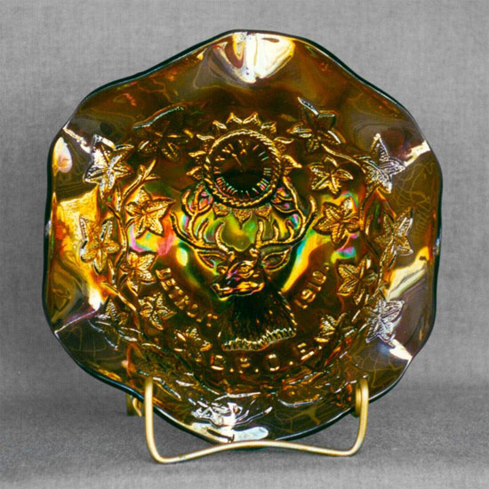 ![]() For the 1910 Grand Lodge Convention, the Fenton Art Glass Company produced several pieces (bowls in multiple colors and a known green plate.) Pictured below are the amethyst ice cream shape (ICS) bowl and the amethyst ruffled bowl. From this year, the green plate and the marigold bowls are highly valuable if you can find them. Interestingly, Millersburg also produced an amethyst bowl for this event which is more valuable than the Fenton one (and is known as the "two-eyed elk" because a second eye is seen on the pattern for the elk.)