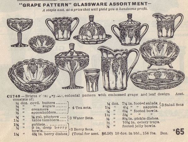 This is Indiana Glass pattern number 154. The pattern is known to collectors as Darling Grape, also called Late Paneled Grape. Others have referred to it has the Indiana Grape and Cable pattern. This "darling" pattern was first produced in about 1913 and was offered for a few years. I believe it was available in both plain and decorated crystal.