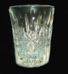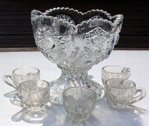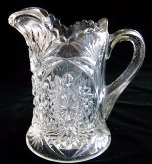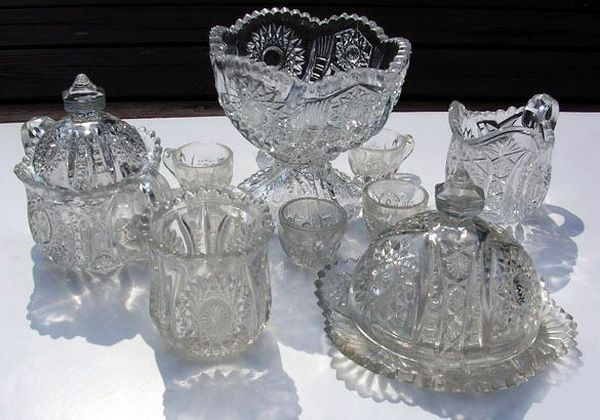 Indiana Glass pattern number 300, known to collectors as Oval Star. The Oval Star pattern was introduced in 1910 and was only used to make these very delightful children's dishes. The complete set consists of a pitcher and 6 tumblers on a tiny tray, a covered butter dish, covered sugar bowl, creamer, spooner, berry set, punch set and a candlestick.
