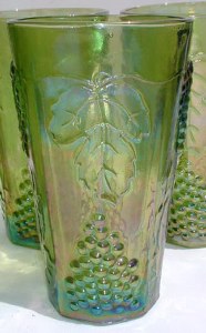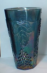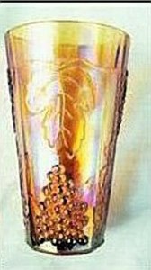 The Harvest carnival glass tumblers were first introduced in blue carnival by the Indiana Glass Company in 1971. By 1974, the gold and lime green carnival colors were added to the line. The original factory name for them was "Coolers". They were meant to be ice tea tumblers.