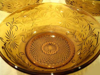 Indiana Glass pattern number 620, known to collectors as the Daisy pattern. The Daisy pattern was introduced in 1933 and continued production until 1940. It was produced in amber and clear crystal. Indiana Glass reissued the Daisy pattern in the 1950's and 60's. The reissues were made in milk glass and dark green glass.