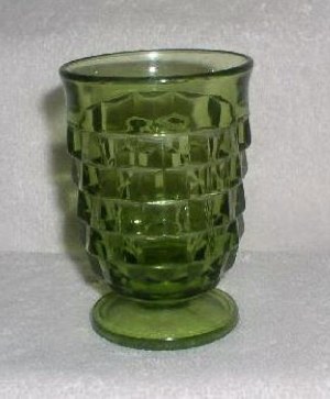 Indiana Glass introduced the Whitehall pattern in the early 1960's. This is Indiana Glass pattern number 521. Whitehall is VERY similar to the Fostoria American pattern. Whitehall is most often seen in the above colors, gold or amber, crystal and olive green. There is also a very pretty light blue, a teal blue and crystal with ruby stain. In the 1980's, the Whitehall candy box was made in blue and green carnival glass. See pictures below.
