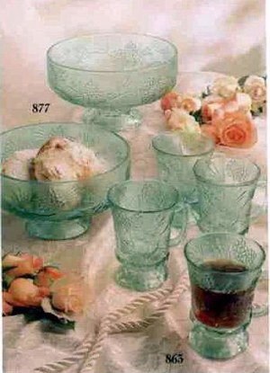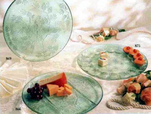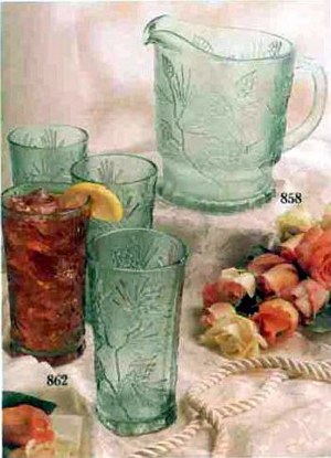 Indiana Glass produced Ponderosa Pine in 1980 and it was sold through Tiara. Ponderosa Pine was made from 1980 until Tiara closed in 1998. The colors made were crystal, crystal etched, Chantilly Green, Spearmint and a rare blue tint that was a color error.
