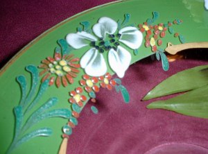 Indiana Pattern number 9, known as Dogwood or Decorated Dogwood. The compote above is clear glass with a 2 inch orange band trimmed with gold. And of course, the brightly painted Dogwood and floral design. This is a 1930's pattern.