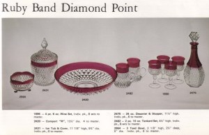 The Diamond Point Ruby Band is probably the most popular of all the Diamond Point Colors. Indiana Glass produced the bulk of the Diamond Point Ruby Band in the 1970's and early 1980's. Below is all the original Indiana Glass catalog material I could find for the Diamond Point Ruby Band. I am fairly confident that it covers all the items made in this color.