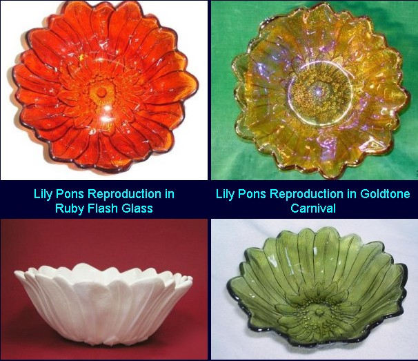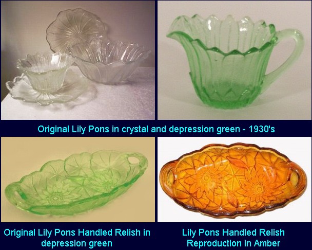 ![]() ![]() Lily Pons is Indiana Glass Pattern Number 605. It was first introduced in 1930 and reproduced many times over the years. The original Lily Pon was made in crystal, green and pink, the usual depression glass colors. The reproductions were made in olive green, amber, milk glass, ruby flash glass and gold carnival glass. Please see the chart below for some of the Lily Pon reproductions made in the 1960's and 1970's.