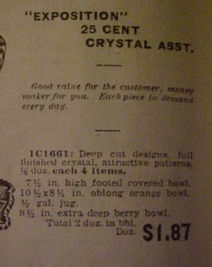 The 8 1/2 inch center bowl was made in crystal in the early 1900's. It was advertised and an 8 1/2 inch extra deep berry bowl. The above ad appeared in 1911.